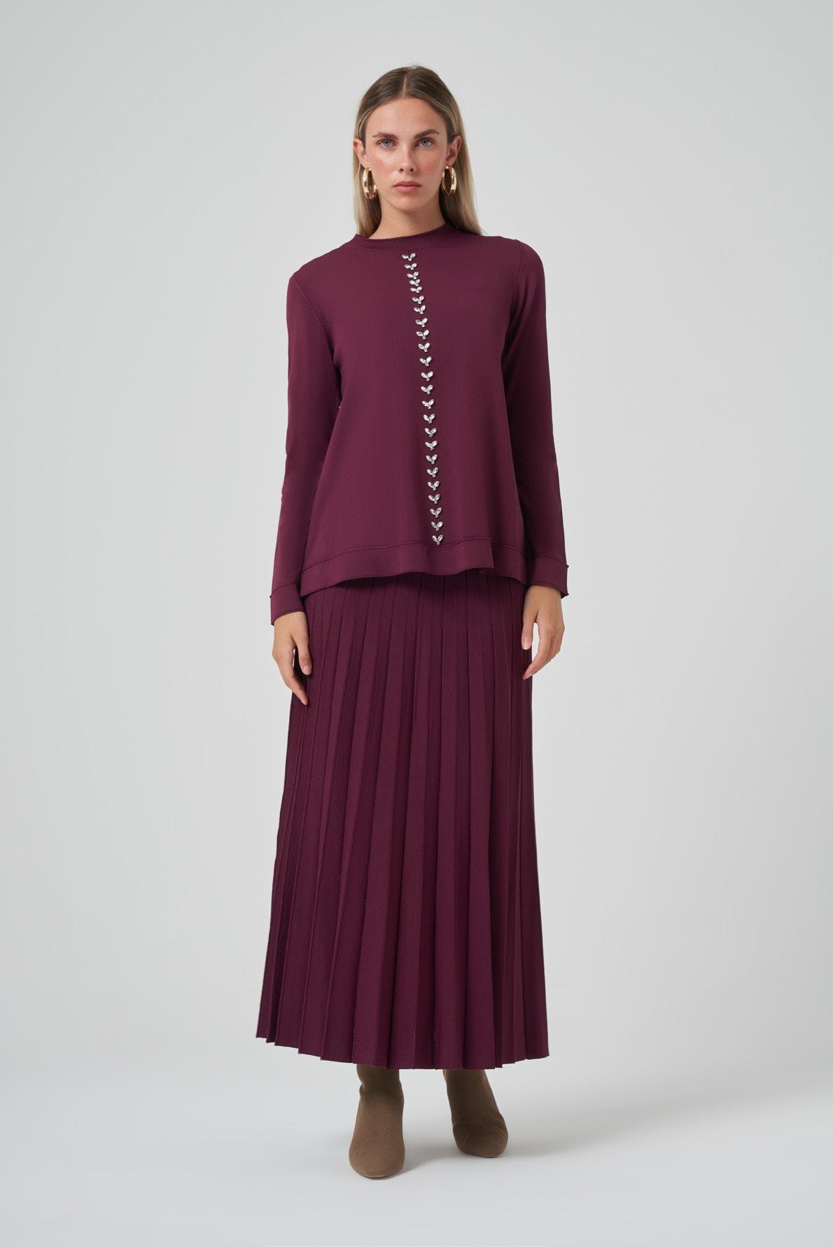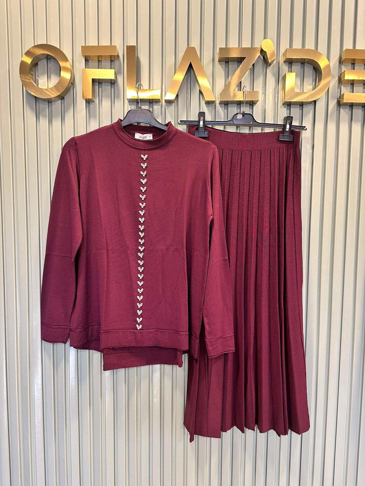 Nuss Ön Taş İşlemeli Etekli Merserize Takım Bordo 1351
