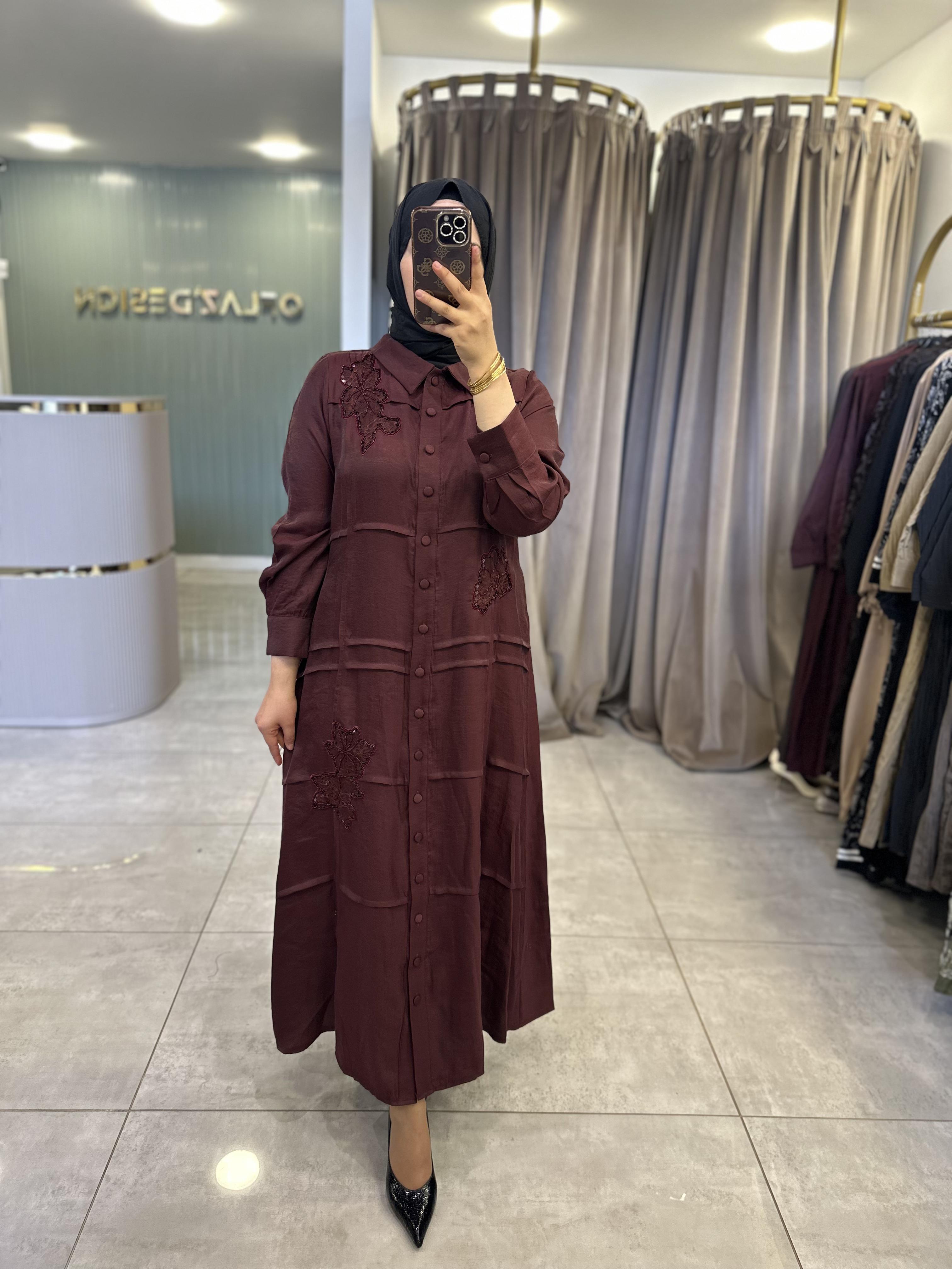 LissMore Çiçeği Boncuk İşlemeli Elbise Kahverengi 6001