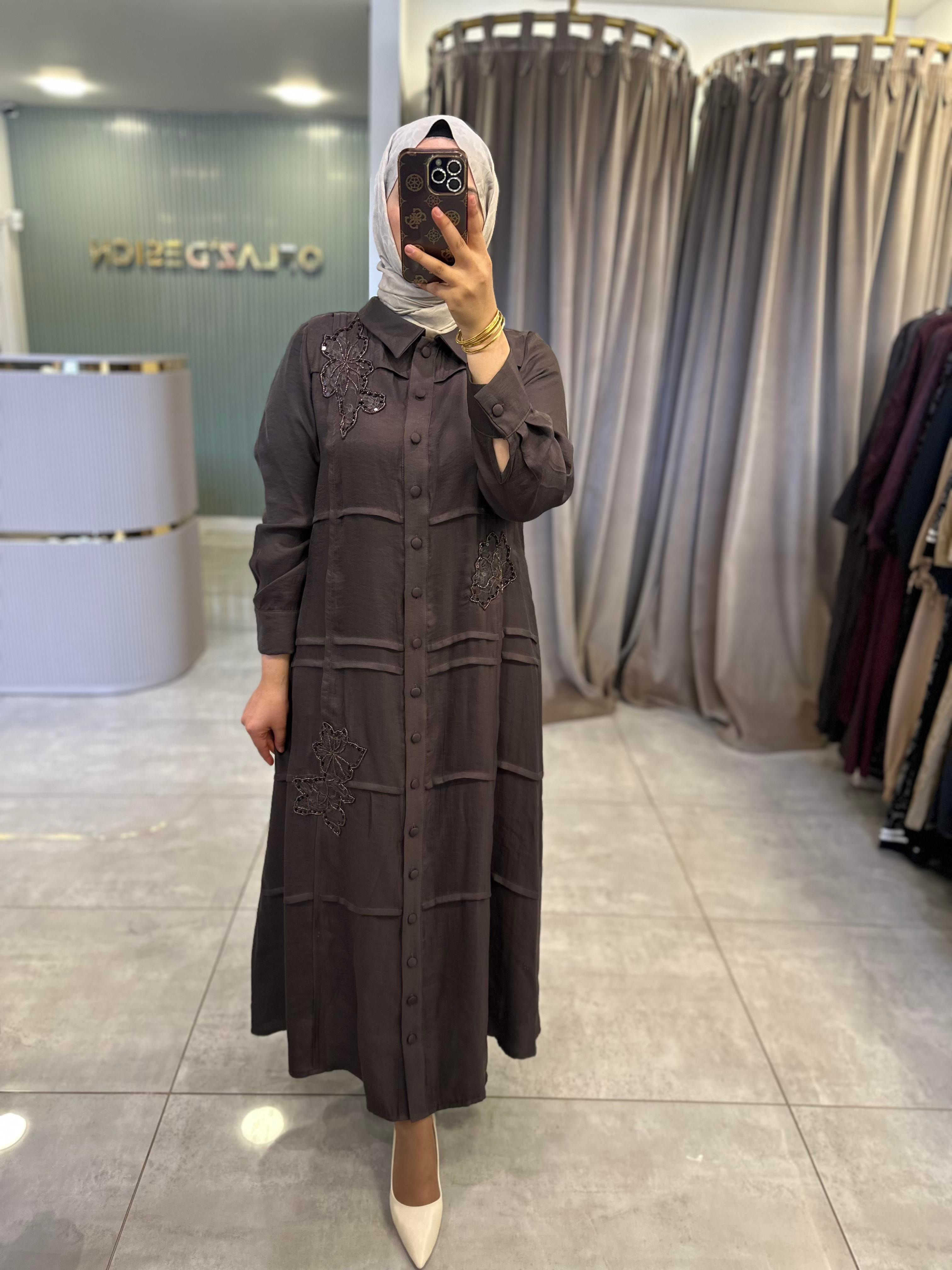 LissMore Çiçeği Boncuk İşlemeli Elbise Kahverengi 6001