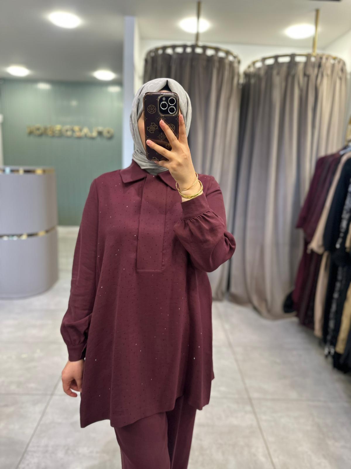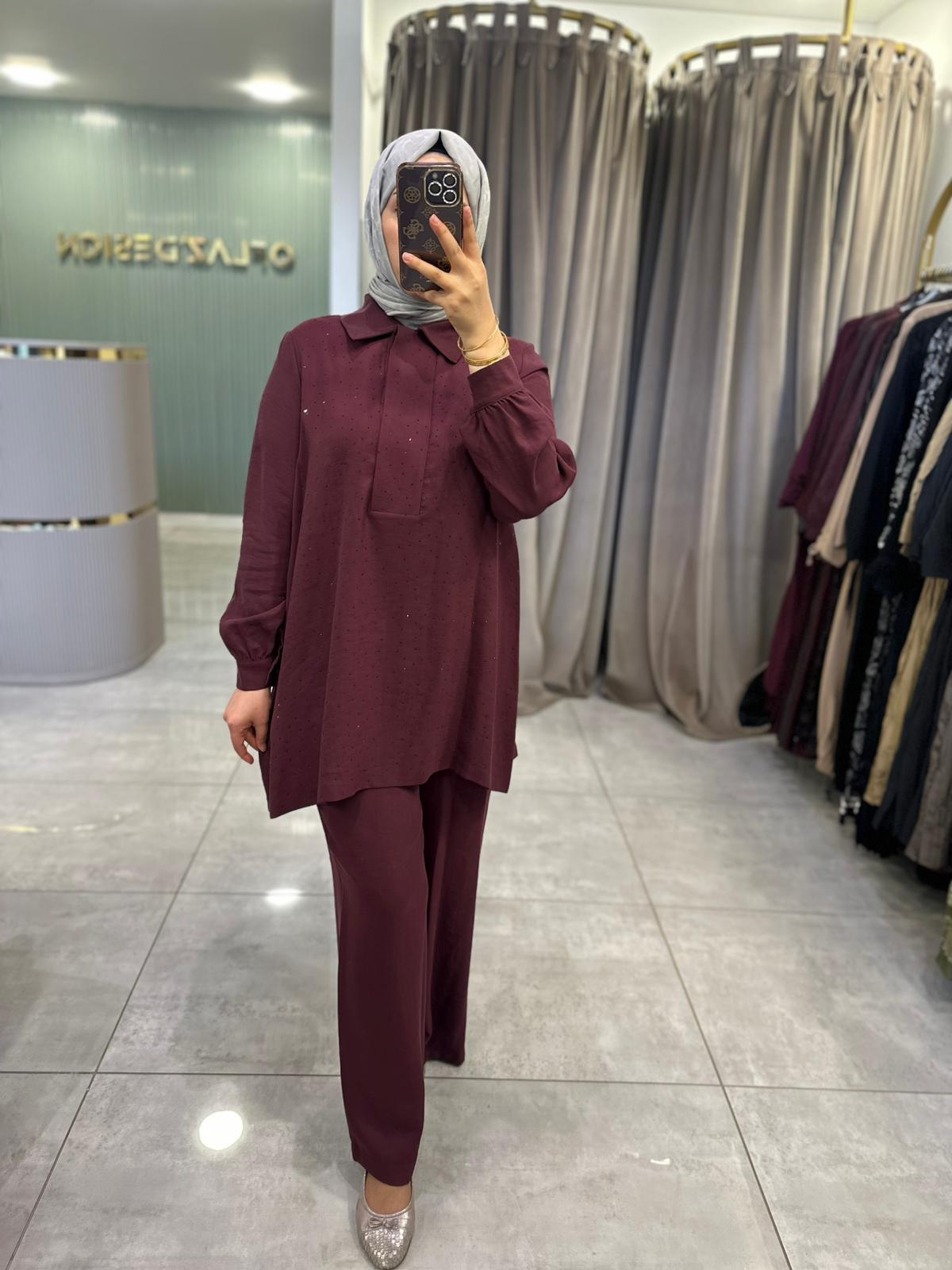 Nuss Serpme Taş Detay Pantolonlu Takım Mürdüm 1019
