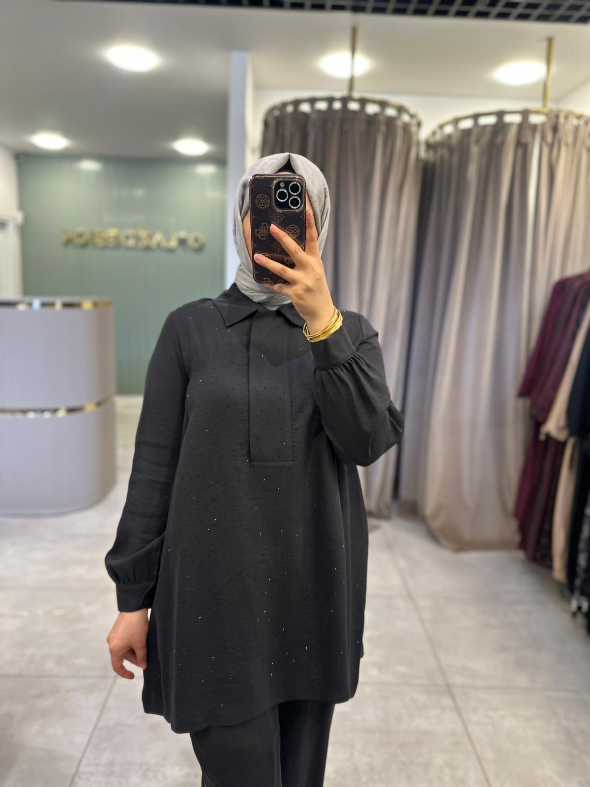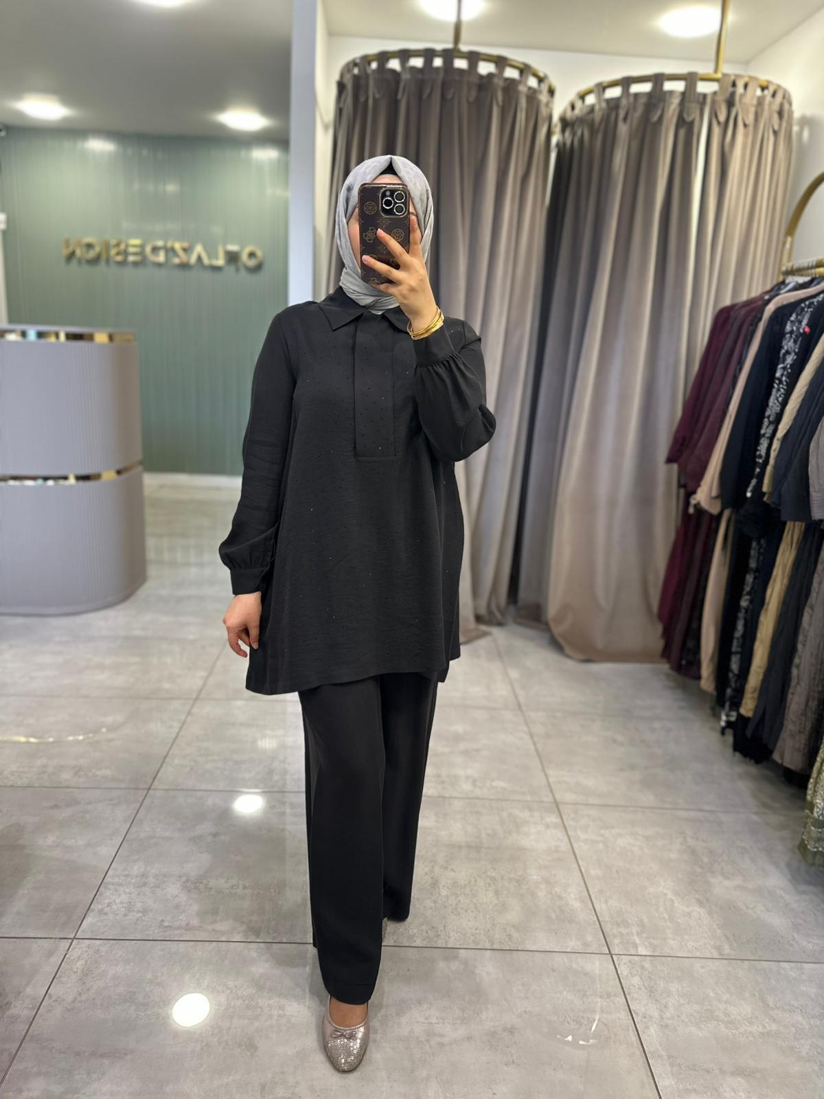Nuss Serpme Taş Detay Pantolonlu Takım Siyah 1019