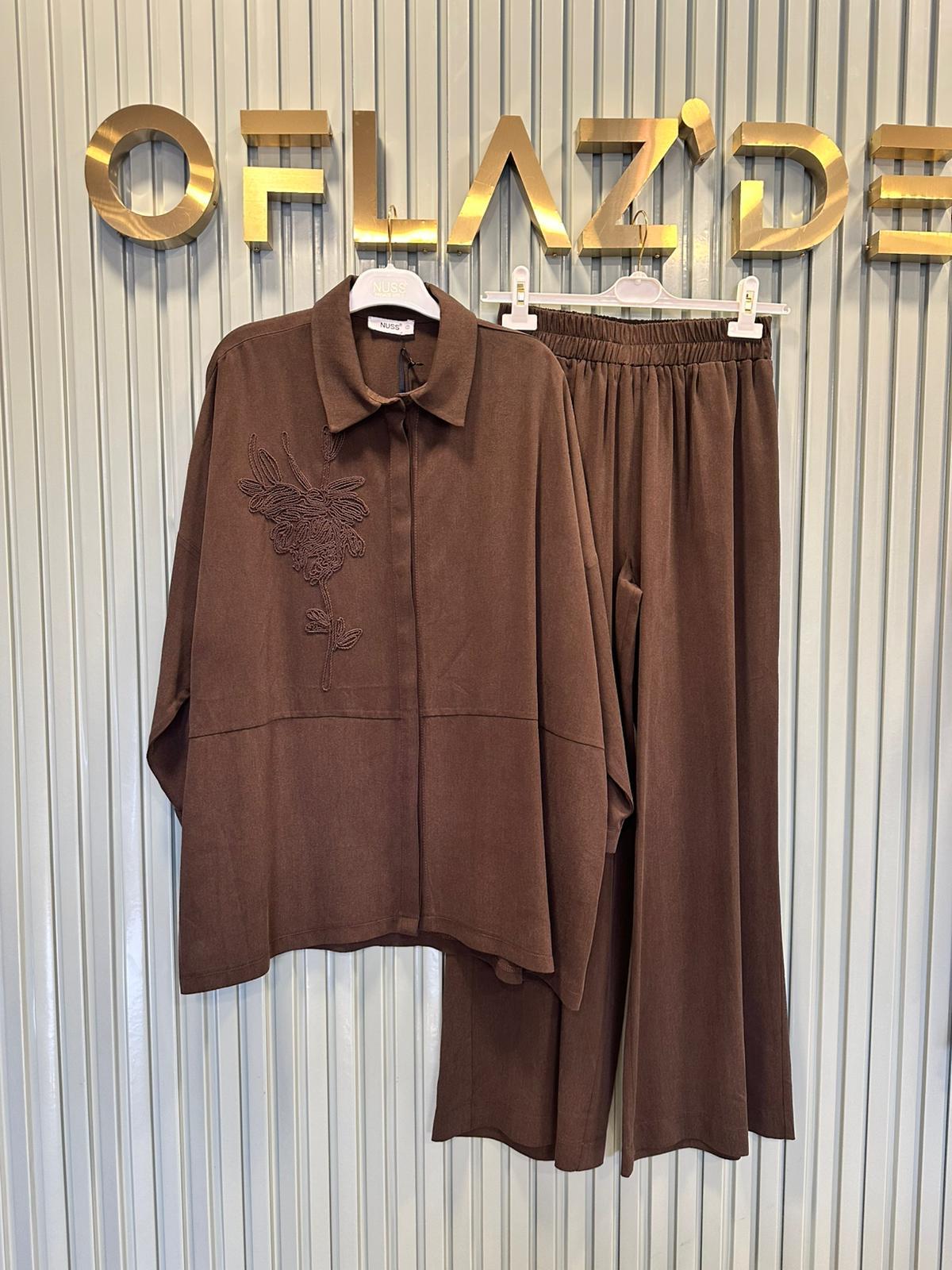 Nuss Yaka Nakış İşlemeli Pantolonlu Takım Kahverengi 1034